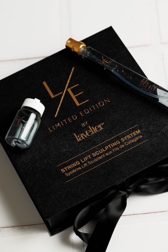 The revolutionary String Lift Sculpting System is a cutting-edge treatment designed to elevate your skincare routine to new heights. The Golden Sculpting Serum works with the Elastic Collagen Threads to achieve a radiant and youthful looking complexion. The Golden Sculpting Serum is saturated with hyaluronic acids and oat extract. The threads are infused with collagen and seamlessly blend with the golden elixir to enhance the appearance of skin texture and minimize the appearance of fine lines, leaving your skin looking more smooth and supple.